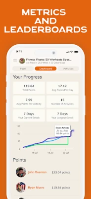 - Each challenge includes dynamically updated personalized progress metrics, charts and leaderboards.