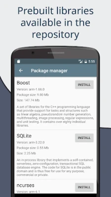 - Package manager and a custom repository with prebuilt packages for common libraries, such as Boost, SQLite, ncurses, libcurl, etc.