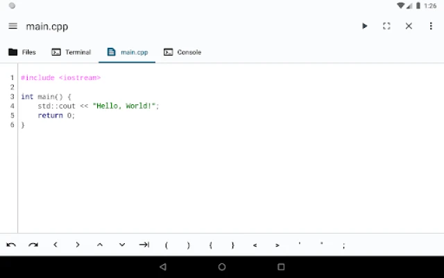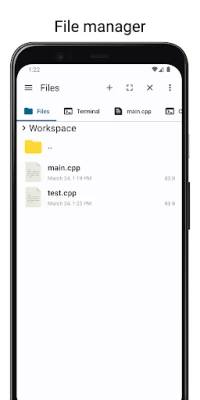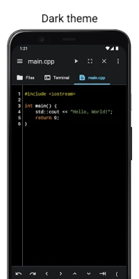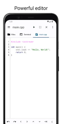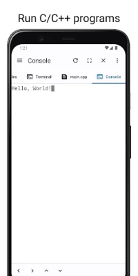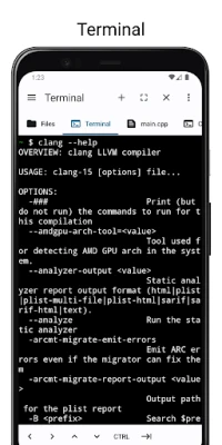 Terminal - Preinstalled with clang, make, cmake, bash etc - Access the shell and commands that ship with android. - Support for tab and arrows even if the virtual keyboard lacks them.