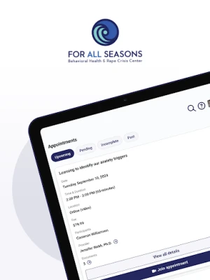 For All Seasons Client Connect, is a secure platform for our existing clients. This innovative platform caters to individuals, families, and couples in need of outpatient mental health therapy, psychiatry, and/or victim services. For All Seasons Client Connect streamlines the process of all scheduling, canceling, and receiving reminders to ensure a seamless experience connecting with For All Seasons staff. This platform allows you to connect through a HIPAA compliant link with your telehealth provider.