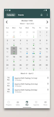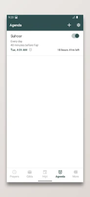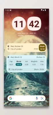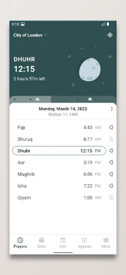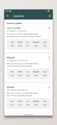 • Shows the times for Fajr, Dhuhr, Asr, Maghrib, Isha, and optional times like Imsak, Shuruq, Duha, Midnight and Qiyam