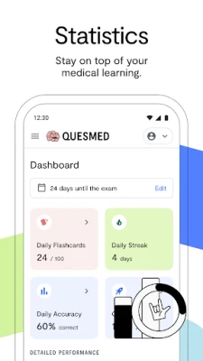 As you answer questions, the Quesmed system learns about the gaps in your knowledge and suggests a daily feed of flashcards.