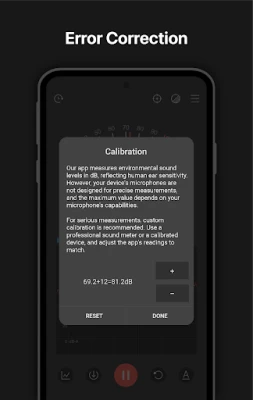 The value of decibel meter or sound meter(dB meter) is not as precise as an actual Sound Pressure Level Meter(SPL Meter), soundmeter, decibel meter or noise level meter, this is due to most device's microphone are aligned to human voice. To fix this, use an actual sound meter or sound pressure level meter (SPL meter) to adjust decibels error as close as possible before use. If you didn't own an actual Sound Pressure Level Meter (SPL meter), go to a very quiet place where sound cannot hear and adjust the reading value to 20~30dB.