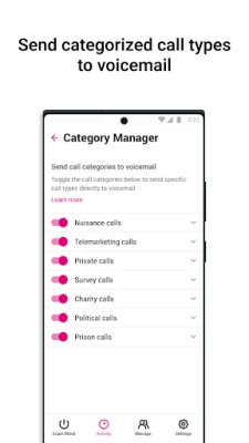 • Category Manager – Tired of telemarketers? Or survey calls? Scam Shield gives you control over what types of calls are allowed to ring your phone.